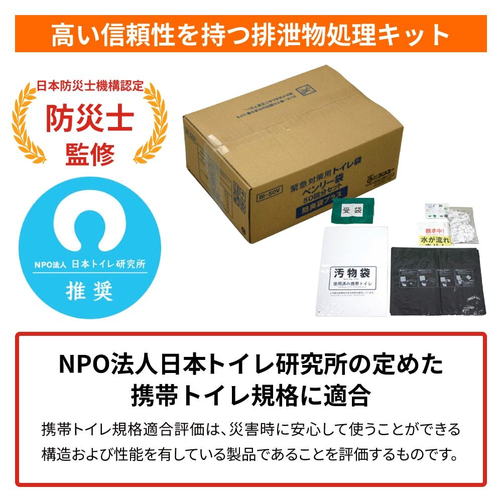 ◎排泄物処理キットの「ベンリー袋 防臭袋プラス(50回分)」は日本防災士機構認定の防災士が監修。NPO法人 日本トイレ研究所が定める「携帯トイレ規格」に適合し、同研究所の推奨も受けている高品質で信頼性の高い商品です。断水時に便・尿を処理する凝固剤、蓄便袋、一時保管用の汚物袋が備わっています。