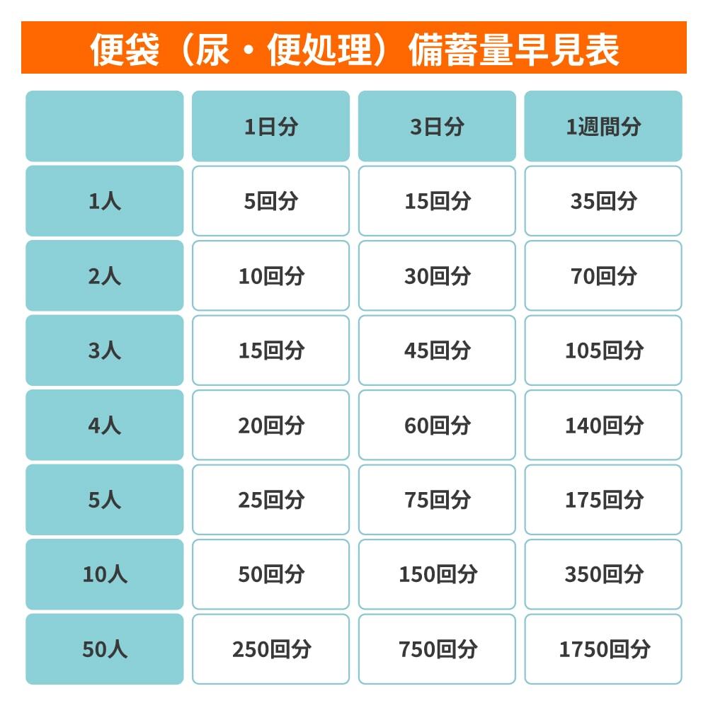 非常食の準備同様、最低3日分から1週間程度の備えをお勧めします。当セット品の便袋は50回分です。10人3日分を準備する場合150回分。1週間分では350回分となります。必要に応じて便袋を追加準備ください。必要数については下記備蓄量早見表をご参照ください。