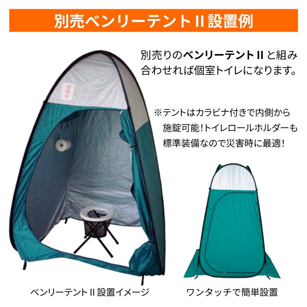 ◎別売:「ベンリーテントⅡ」と組み合わせれば個室トイレになります。テントはワンタッチで簡単設営でき、テント内側から付属のカラビナで施錠できます。トイレロールホルダーも標準装備なので、トイレロールを清潔に保て災害時の使用に最適です!