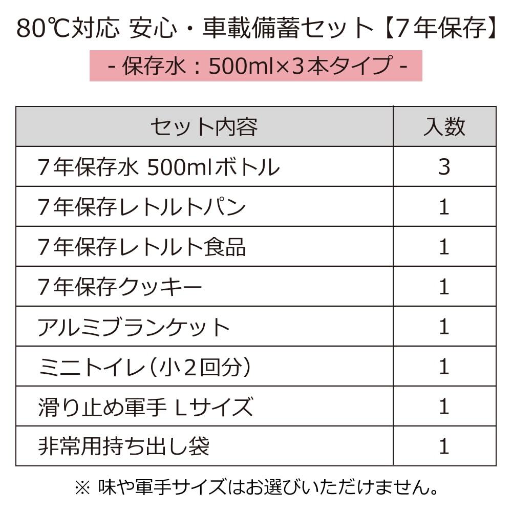 80℃対応7年保存 安心・車載備蓄セット(保存水500ml×3本)内容