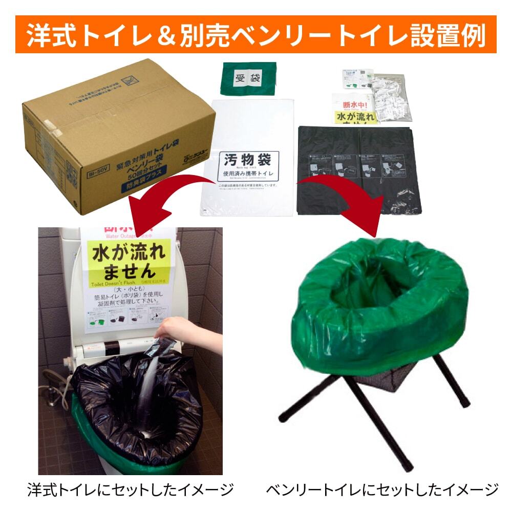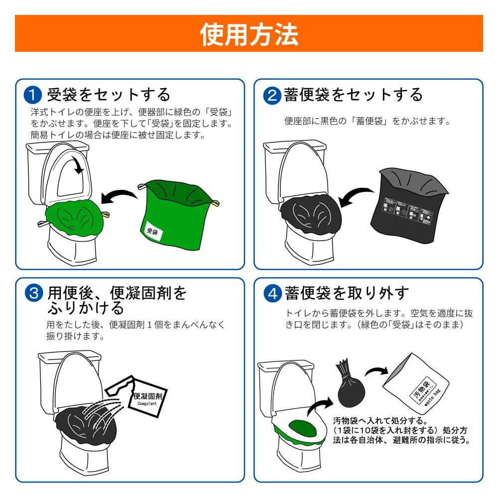 ベンリー袋は断水時など水が使用できない状況での便・尿を処理する汚物袋、便袋、凝固剤のセット商品です。