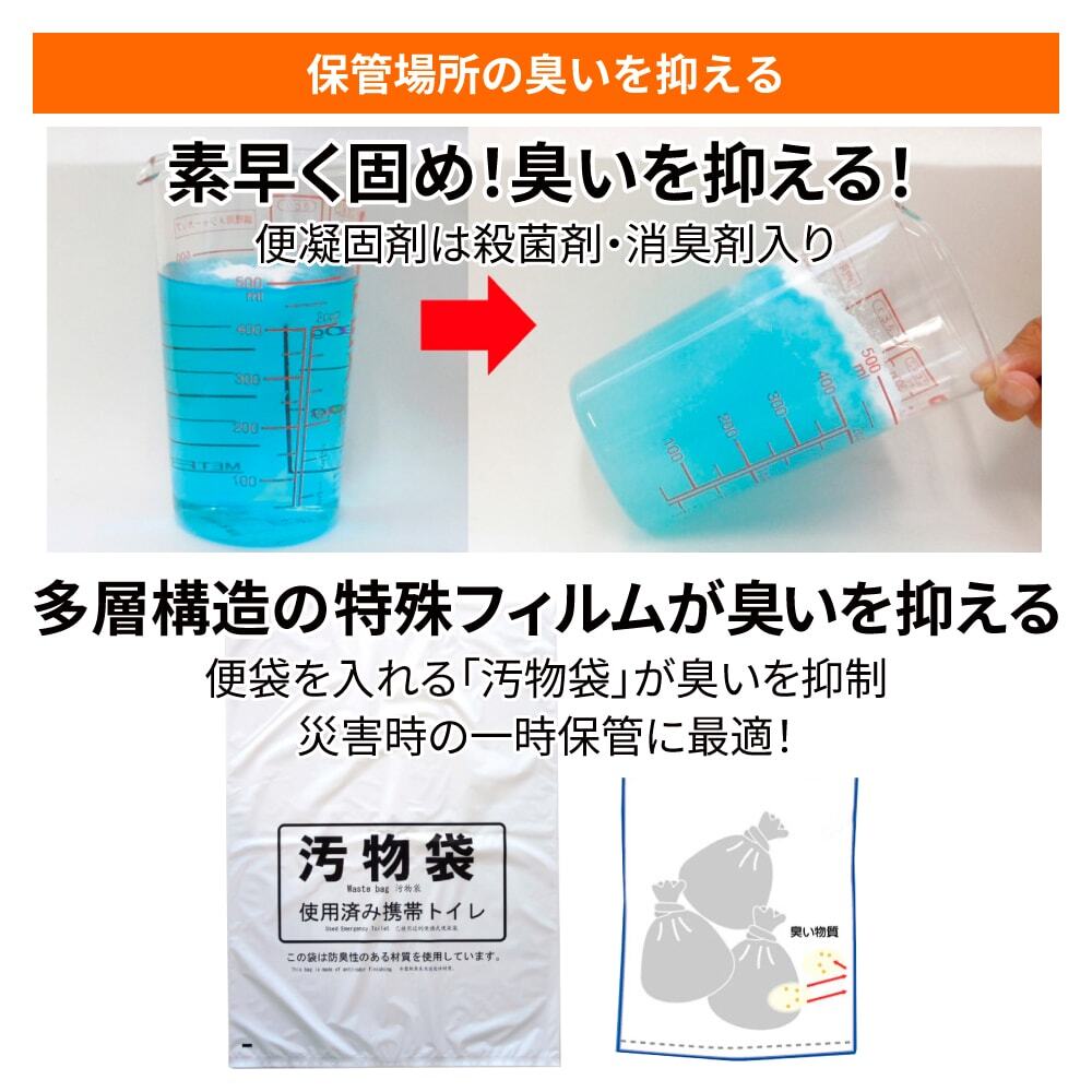 ◎蓄便袋を入れる汚物袋には多層構造の特殊フィルムを使用しており、臭い漏れを抑えます。破れにくい袋のため災害時の一時保管時も安心です。