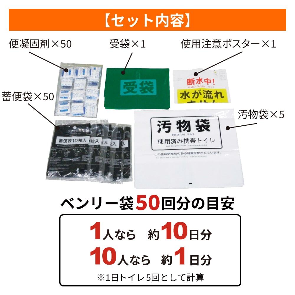 便凝固剤×50、蓄便袋×50、汚物袋(防臭袋)×5、受袋×1、使用注意ポスター×1