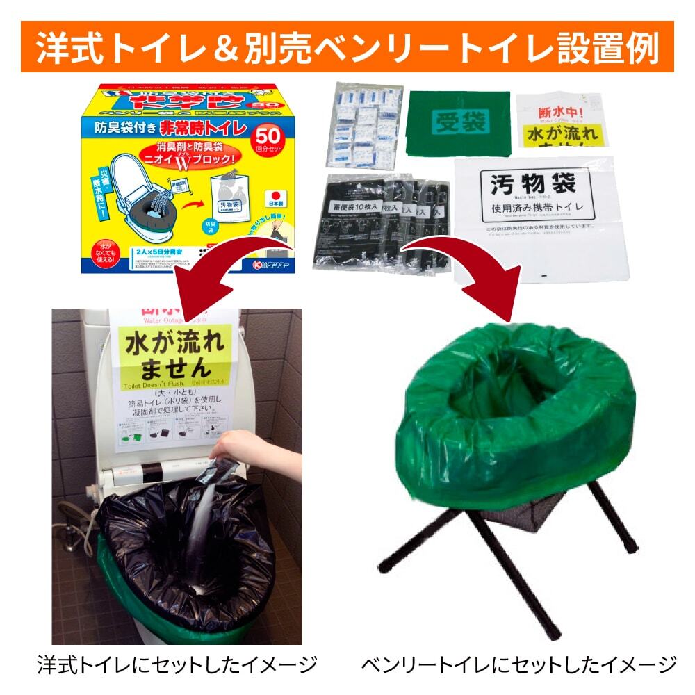 ベンリー袋Gは断水時など水が使用できない状況での便・尿を処理する汚物袋、便袋、凝固剤のセット商品です。