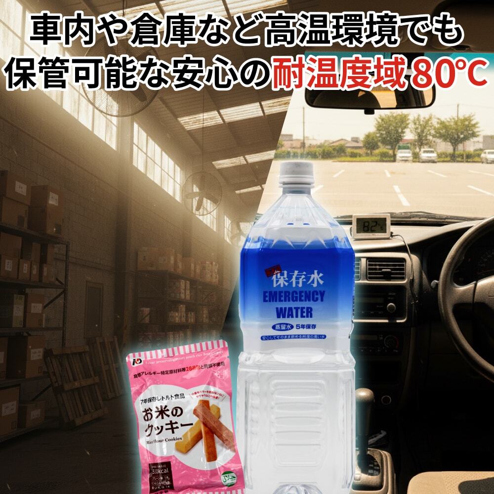 ・多くの保存食・保存水は常温保存(15~35℃程度)を想定して作られており、夏場の車内など高温環境での保管に対応していません。