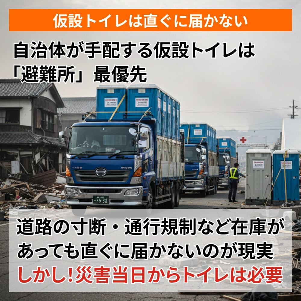 災害時、自治体の手配する仮設トイレは「避難所」が最優先されるため、企業は自力でリース会社などから調達する必要があります。その仮説トイレも、道路の寸断・通行規制などで直ぐに届かないのが現実です。