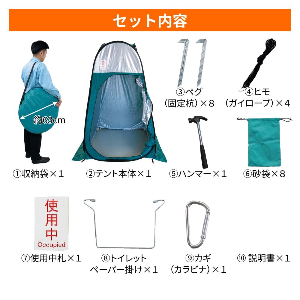 テント本体×1、収納袋×1、ペグ(固定杭)×8、ヒモ(ガイロープ)×4、ハンマー×1、砂袋×8、使用中札×1、トイレットペーパー掛け×1、カギ(カラビナ)×1、説明書×1