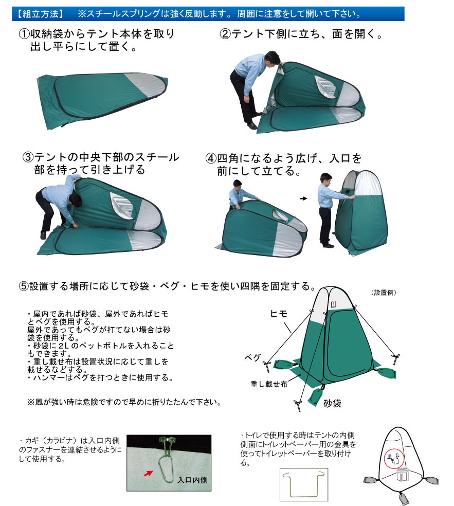 ・組立時・収納時ともに、テント本体のスチールスプリングは強く反動します。周囲に注意をして作業してください。