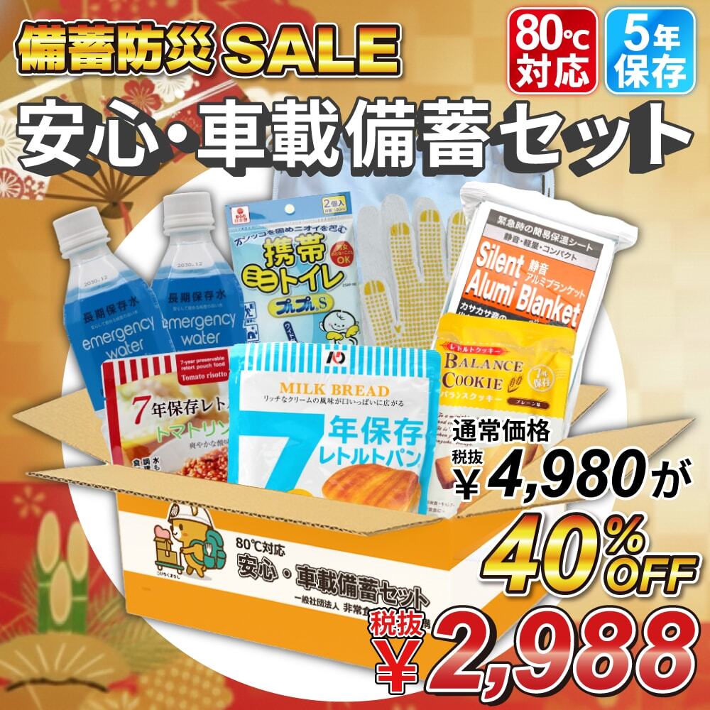 安心・車載備蓄セットは80℃対応の食料と水、車に常備したい防災品をセットにしました。
